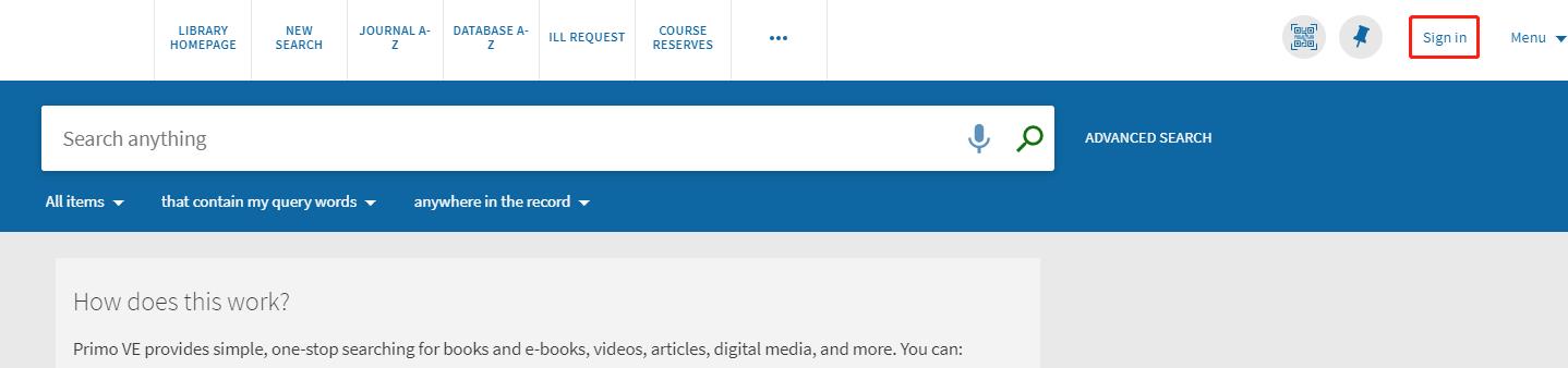 7. You may sign in to your library account with your BNBU email address and password on the top right corner of the Primo VE page to: