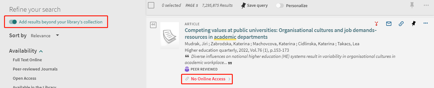 5. If you turn on the “Add results beyond your library’s collection” option, you will discover more resources related to your search that are held by other libraries. These external items are marked with “No Online Access” link.