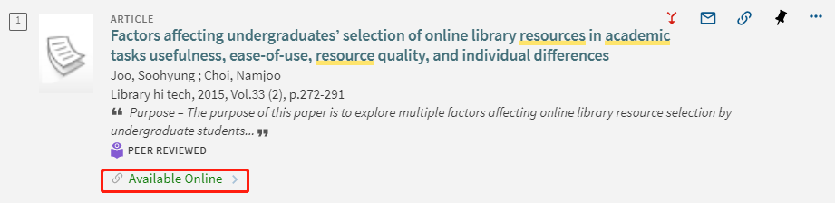 4. Each record provides information on an item’s resource type, title, author, year, and availability. If an electronic resource is available, you will see an “Available Online” link. Click “Available Online” to full text sources, where applicable.