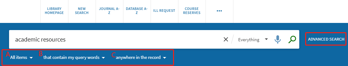 C: Specify search fields, such as in the title, as author/creator, ISBN, ISSN, etc.