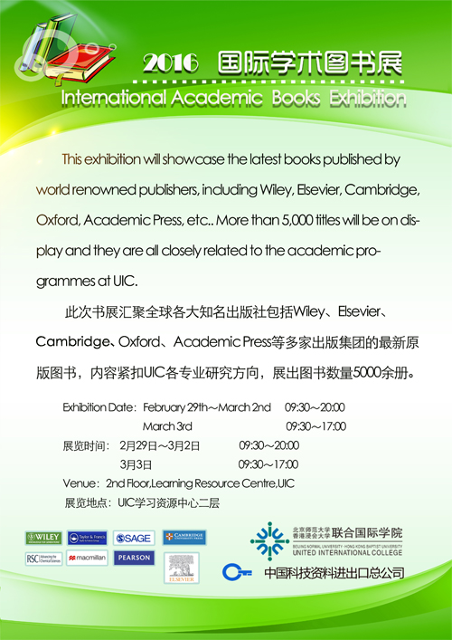 LRC will be hosting the 3rd International Academic Books Exhibition for Academic Year 2015-2016 from Monday, February 29th to Thursday, March 3rd, 2016. Over 5000 titles published by renowned international academic publishers, including those from Hong Kong and Taiwan will be on display at the LRC. Subject coverage closely relates to the various academic programs offered at UIC.