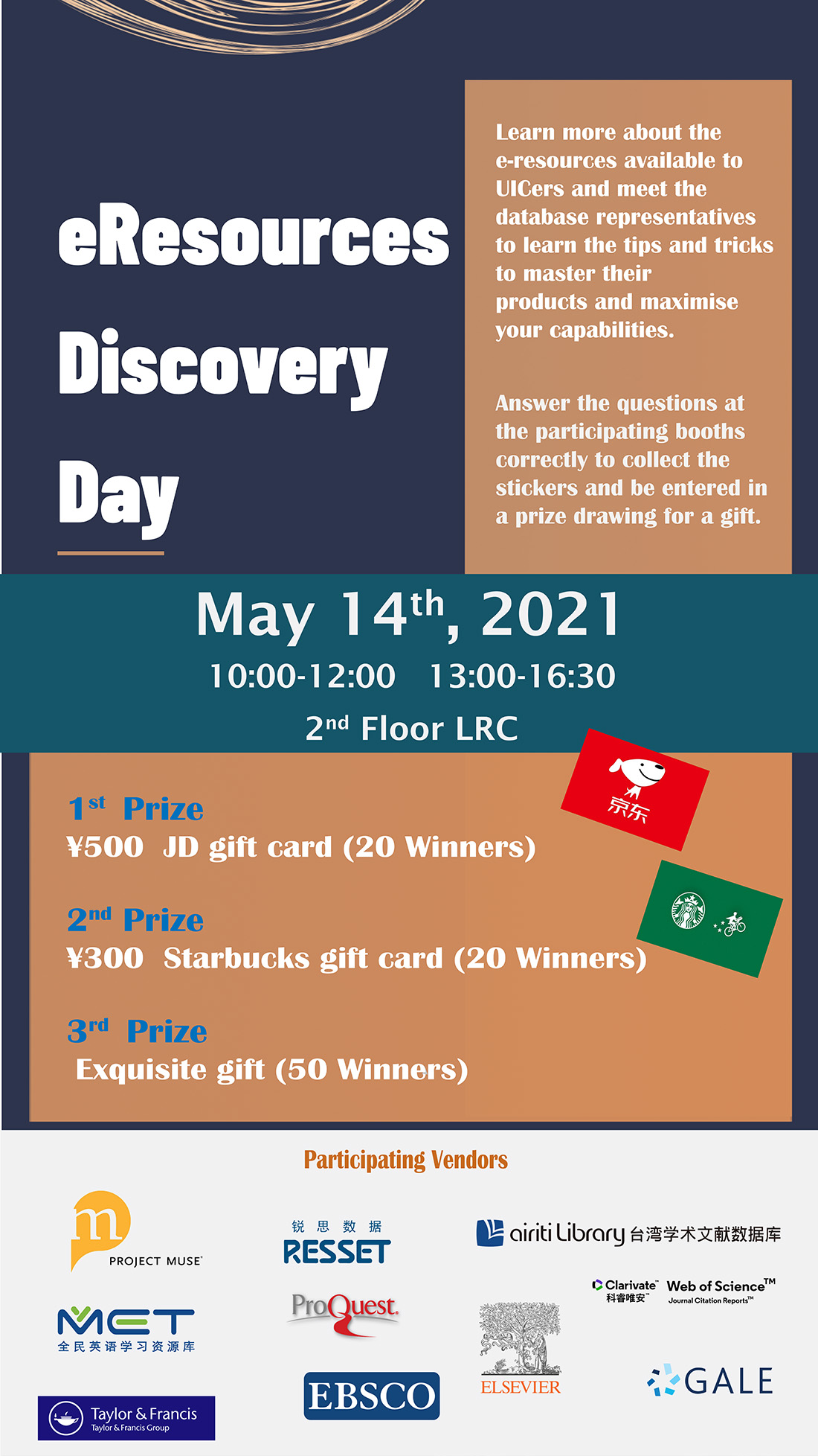 You are cordially invited to the LRC’s E-Resources Discovery Day on Friday, May 14th 2021. Database representatives will be available to help you better understand their resources currently available at the LRC. You may participate in a lucky draw by answering questions at the participating booths.