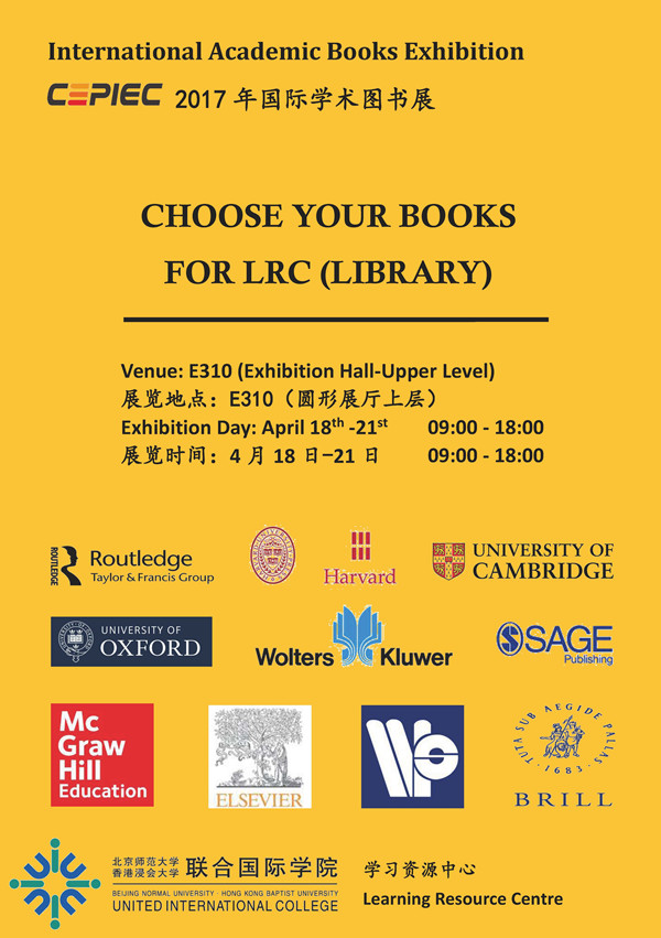 学习资源中心将于4月18日到21日(周二至周五)在教学楼E310(圆形展厅上层)举办2016-2017学年第二次国际学术图书展,届时将会展出超过5000册由国际知名学术出版社最新出版的图书,内容紧扣UIC各专业研究方向。诚挚邀请师生前来挑选自己喜欢的图书纳入图书馆馆藏。