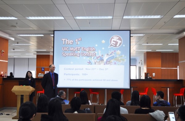The Learning Resource Centre and the English Language Centre jointly organised the 1st UIC MyET (My English Tutor) English Speaking Contest from 23 November to 5 December. Over 160 UIC students participated and 77% of the participants received a score of 80% or above. This contest served as an unprecedented experience for the contestants and many of whom were inspired by the fun challenge of the contest.
